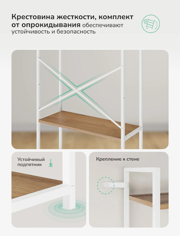 Крестовина жесткости снижает раскачивание, предусмотрено крепление к стене для защиты от опрокидывания.