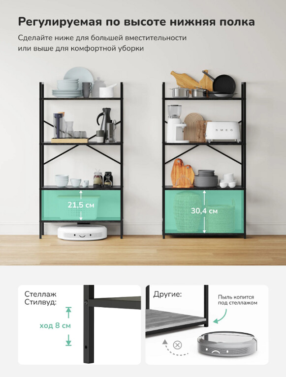 Нижняя полка регулируется по высоте (ход 8 см), гибкая организация пространства под разные предметы.