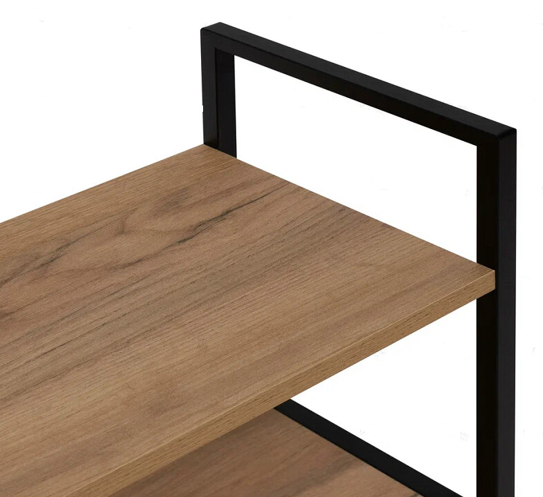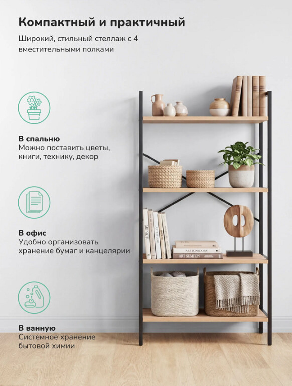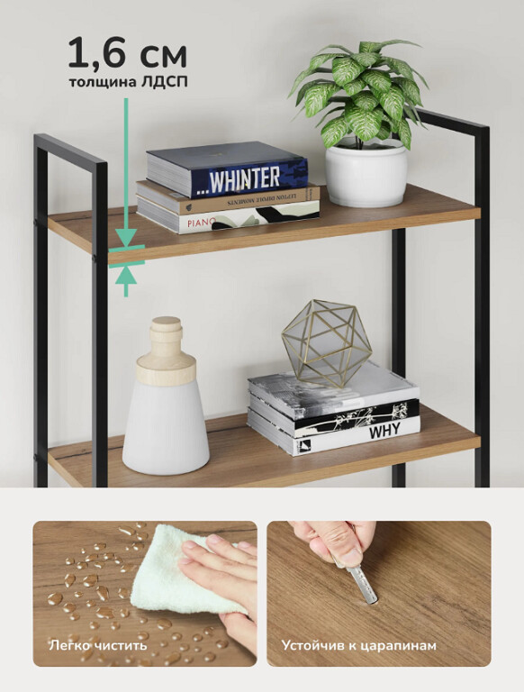 Напольный стеллаж Leset Стилвуд для хранения и организации вещей в прихожей, гостиной или на кухне, который помогает экономно использовать пространство и поддерживать порядок, а также выдерживать повседневные нагрузки.Каркас из металлического профиля 1.5 см, толщина 0.1 см с порошковым покрытием обеспечивает жёсткость и долговечность, крестовина жесткости и крепление к стене добавляют стабильности и безопасности. Полки из ЛДСП толщиной 1.6 см легко чистятся, устойчивы к царапинам и выдерживают до 20 кг каждая.