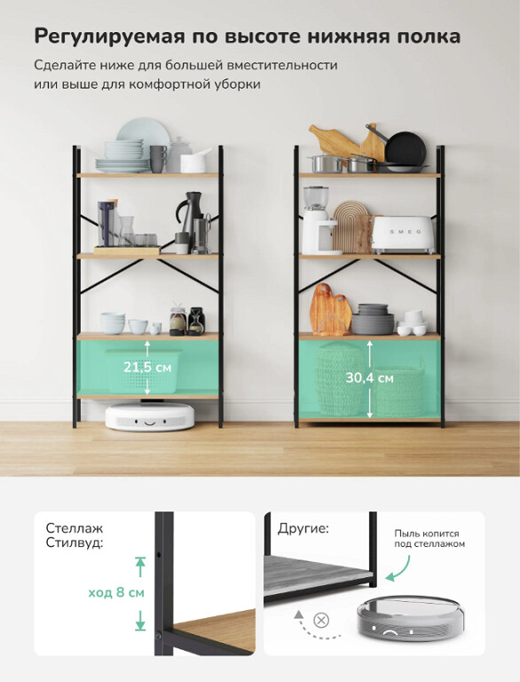 Нижняя полка регулируется по высоте (ход 8 см), гибкая организация пространства под разные предметы.