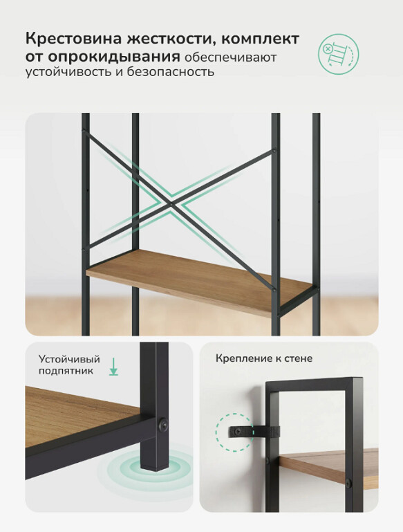 Крестовина жесткости снижает раскачивание, предусмотрено крепление к стене для защиты от опрокидывания.