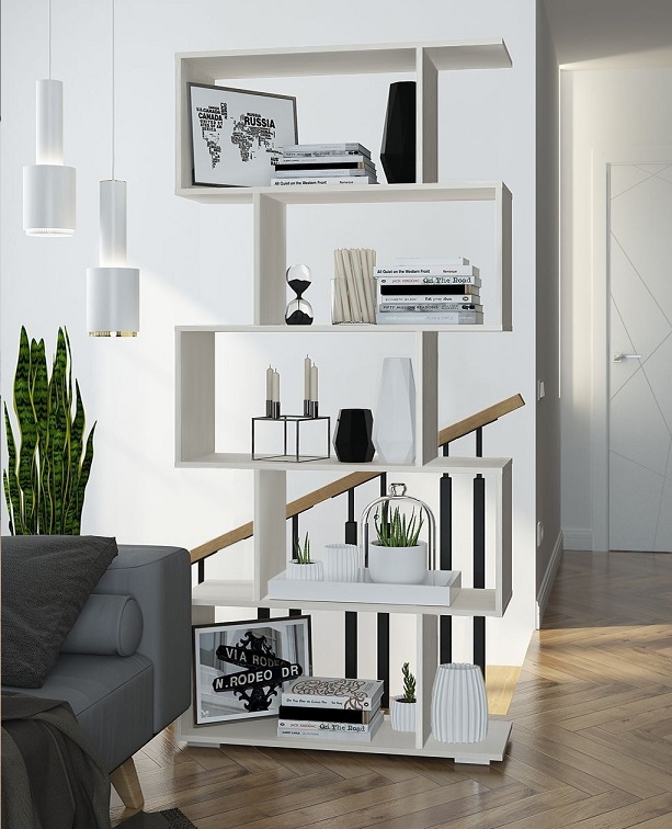 Современный стиль, продуманная система хранения, позволяют рационально организовать пространство в небольшой квартире с использованием стеллажей