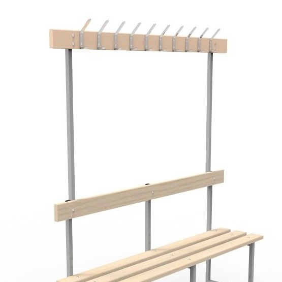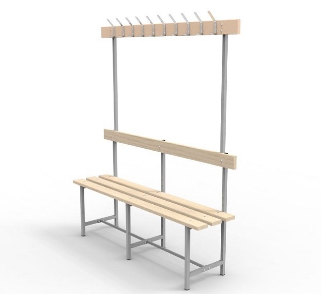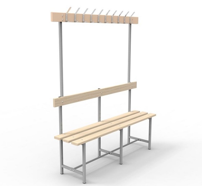 Скамья СВТ-5 с крючками предназначена для раздевалок в спортивных учреждениях, предприятий, офисов и т. д. Металлический каркас и доски из натуральной древесины обеспечивают надежность и долговечность эксплуатации. Каркас — стальная квадратная труба размером 25×25×1,2 мм. Материал сиденья — шлифованная деревянная доска толщиной 20 мм, покрытая специальным защитным маслом для дерева. Спинка на скамье обеспечит комфортное сиденье, а крючки удобное размещение вещей.Поставляется в разобранном виде, в компактной картонной таре. Простая сборка. Крепеж для монтажа к полу в комплекте не идёт.