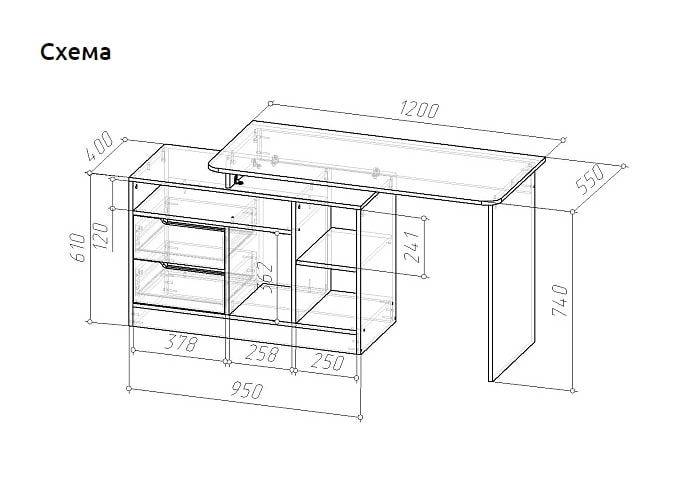 Письменный стол с опорной тумбой. Опорная тумба состоит из четырех отделений, одно из которых укомплектовано полкой. Опорная тумба имеет 2 выдвижных ящика с фрезерованными ручками. Надежное соединение столешницы с опорной тумбой осуществляется через проставку высотой 125мм.Конструкция стола предусматривает как прямое, так и угловое расположение опорной тумбы. Стол может быть собран как на левую, так и на правую сторону. Все модификации дают возможность подстроить его под Ваш вкус и интерьер.