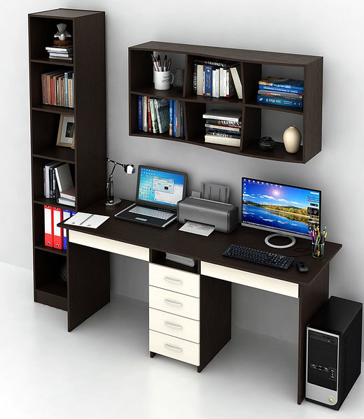 Стол один, а рабочих пространств два - это о модели компьютерного стола Тандем-2Я. За ним комфортно могут расположиться 2 человека, причем у каждого будет своя рабочая зона: зонирование осуществляется с помощью тумбы с 4 выдвижными ящиками, которая стоит посередине. Такая модель стола идеально подойдет как семьям с детьми, так и в офис.