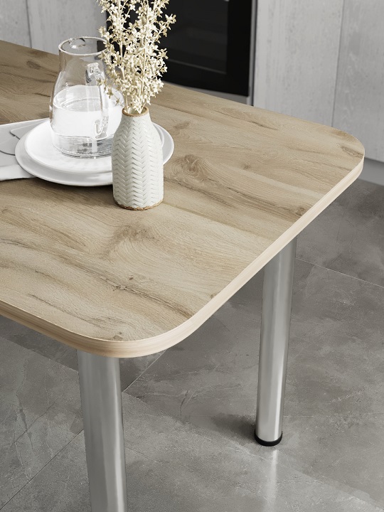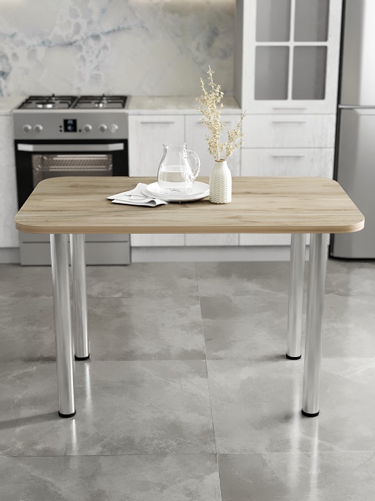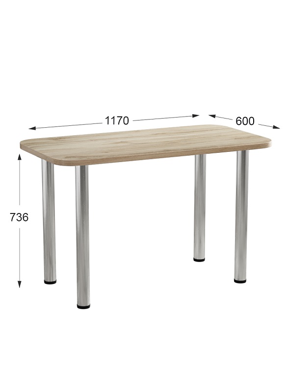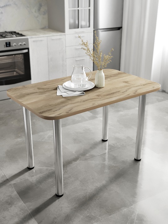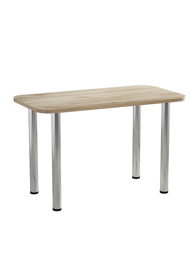 Стол кухонный СН-105.01 — небольшой и комфортный обеденный стол, позволяет свободно расположить за собой до четырех персон.Прямоугольная столешница с закругленными углами позволяет ставить стол как в угол, так и на середину помещения. Хромированные ноги-трубы с блеском, гармонично сочетаются с цветом столешницы. Кромки стола закрыты лентой ПВХ толщиной 2 мм.