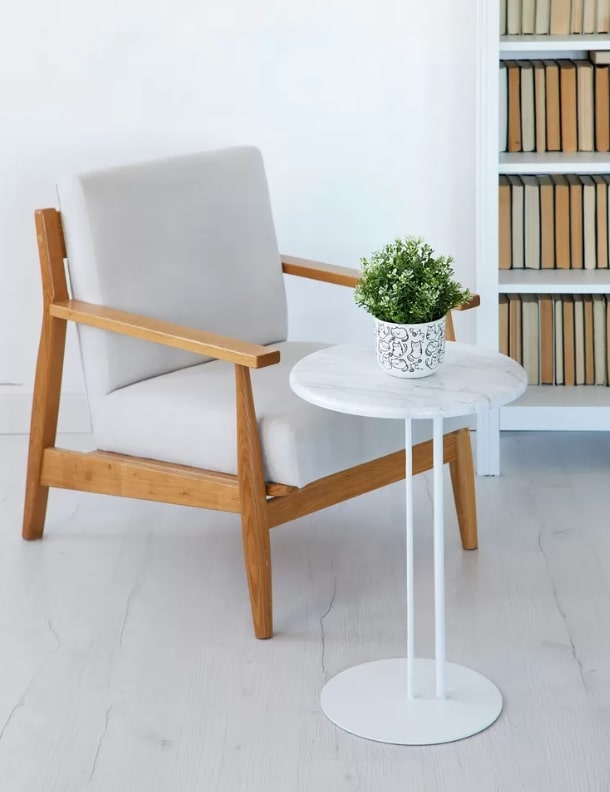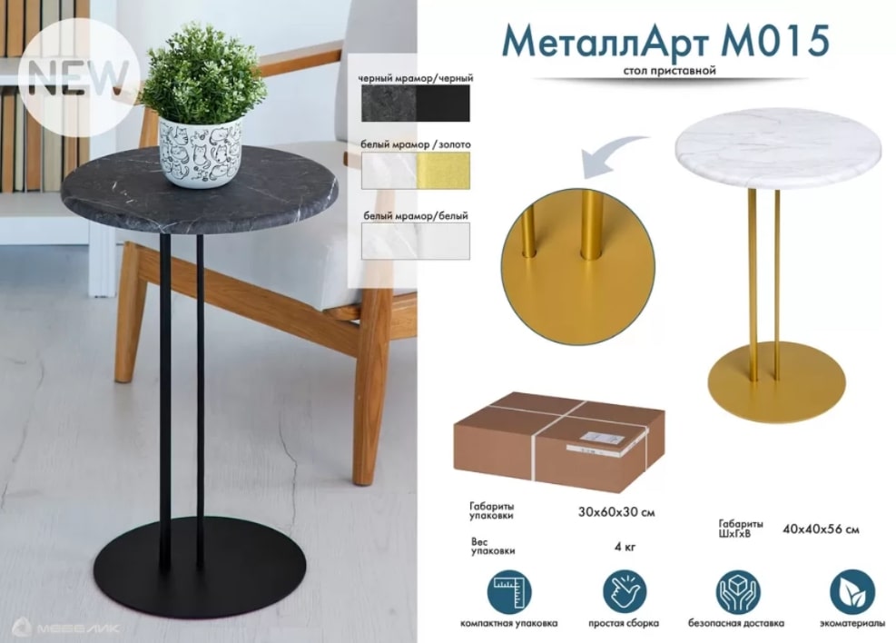 Приставной стол МеталлАрт М015 — это изящное и функциональное дополнение для вашего интерьера. Он сочетает в себе надёжность и качество материалов. Круглая столешница, диаметром 40см, выполнена из МДФ, покрытой плёнкой. Металлические основание, диаметром 30см, и опоры гарантируют надёжность. Стол легок в уходе и очень мобилен и многофункционален. Его высота — 56см.