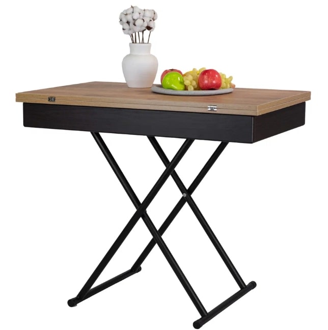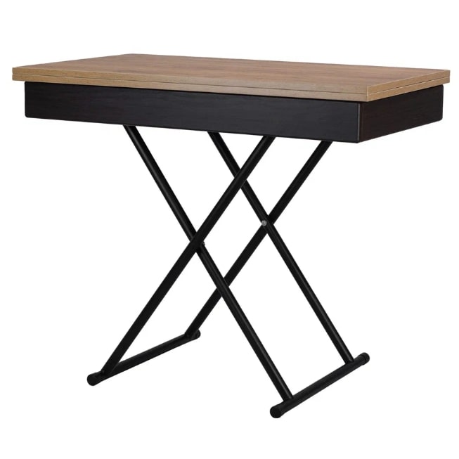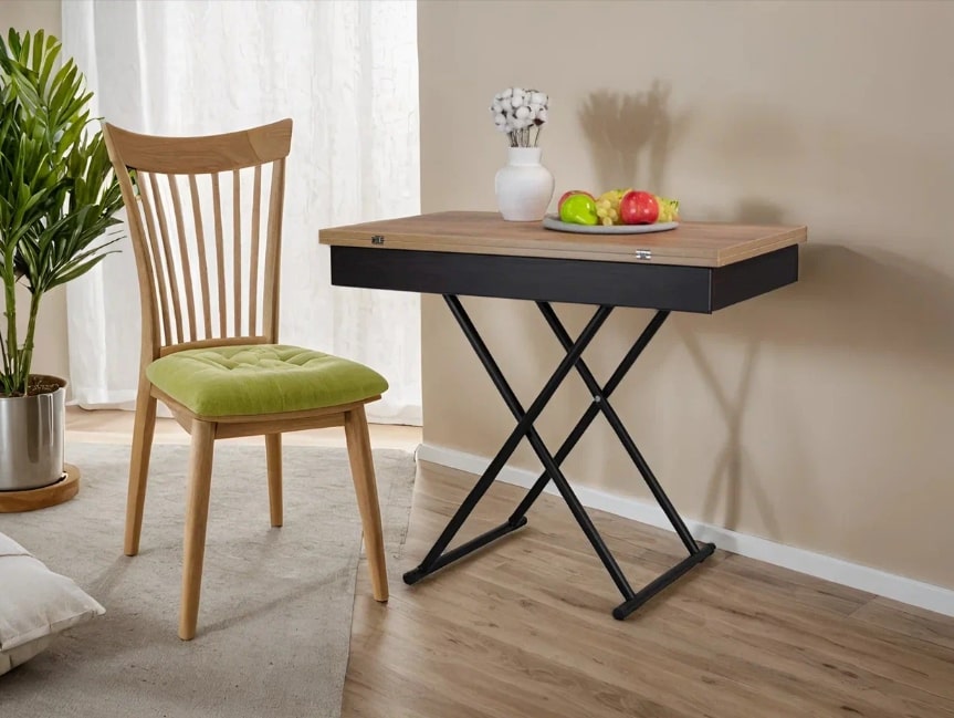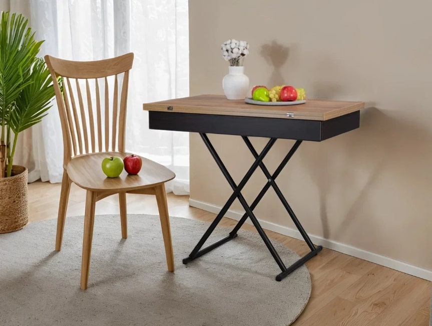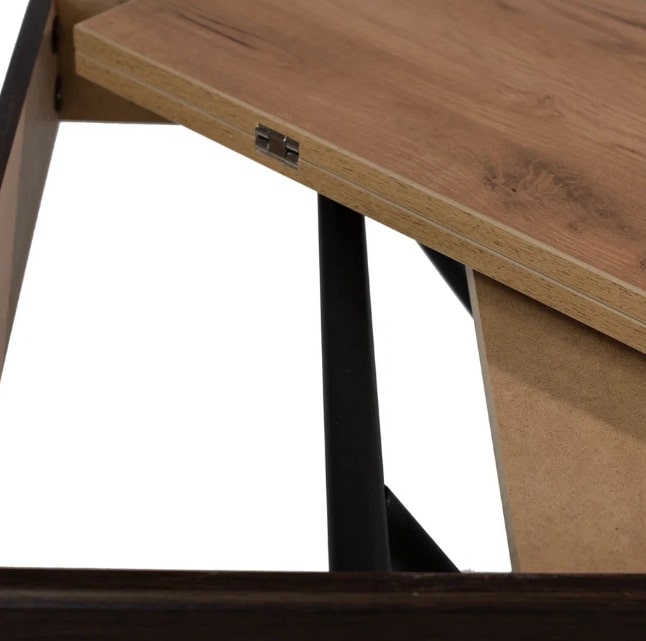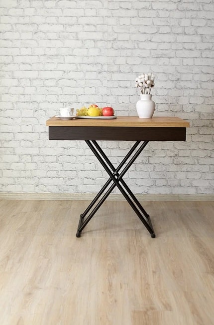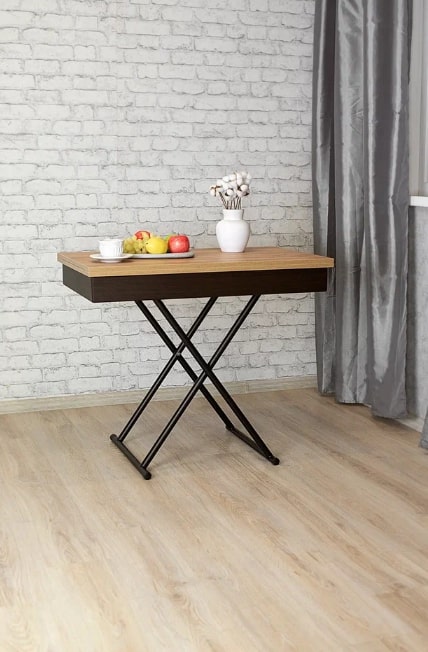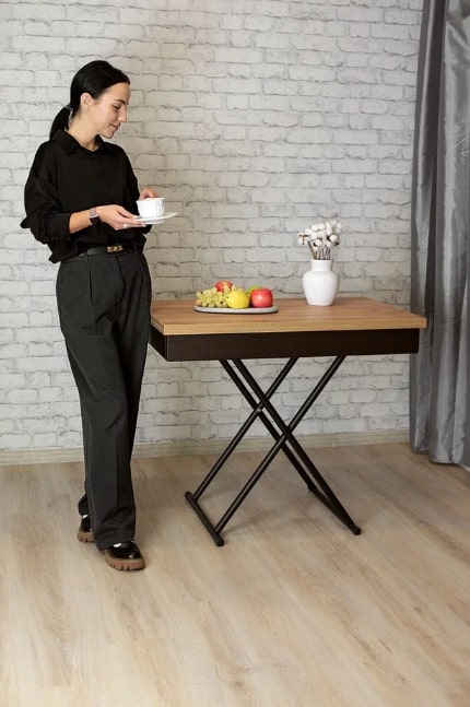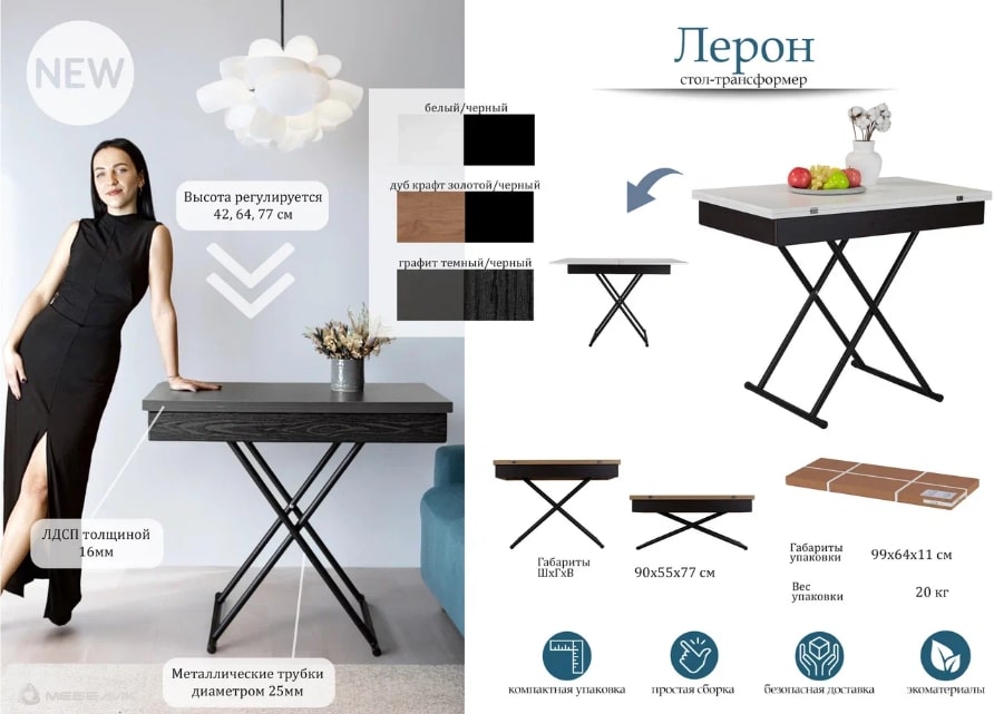 Стол-трансформер Лерон – это инновационное решение для вашего интерьера. Столешница из ЛДСП толщиной 16мм и каркас из металлических трубок диаметром 25мм, обеспечивают прочность и долговечность. Возможность трансформирования позволяет использовать его как обеденный, журнальный, сервировочный или даже как прикроватный столик.По высоте изделие имеет три положения со сложенной столешницей: 420мм, 640мм, 770мм; и три положения с разложенной столешницей: 405мм, 625мм, 755мм. Раскладывающаяся столешница — это находка для тех, кто любит принимать гостей или просто хочет иметь больше пространства для творчества и работы. В сложенном виде она имеет размеры 550х900мм, в разложенном 1100х900мм.