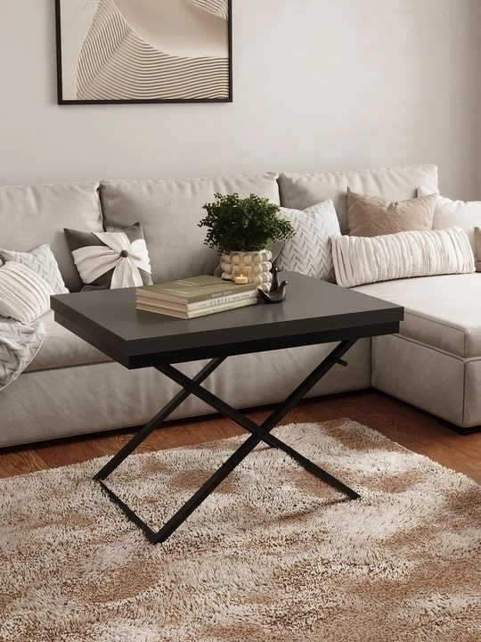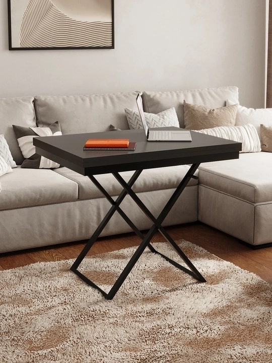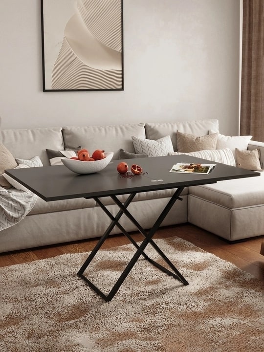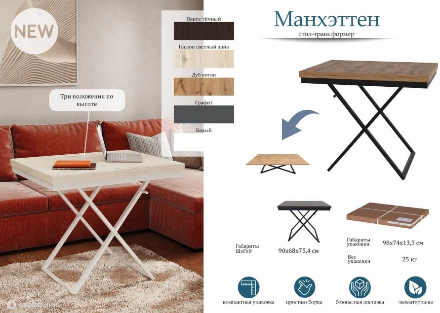 Стол-трансформер Манхэттен — практичная мебель для современного интерьера. Превращается из компактного журнального 900х680 мм в обеденный стол 1360х900 мм. Надежная столешница из ЛДСП на металлическом каркасе дополнена удобным подъемным механизмом. Три положения по высоте позволяют адаптировать стол под разные задачи. Универсальный дизайн подходит для гостиной, спальни или дачи, идеален для семейных ужинов и встреч с друзьями.Варианты цветового решения: Белый / Черный, Графит / Черный, Дуб вотан / Черный, Венге темный / Черный, Гаскон светлый пайн / Крем.