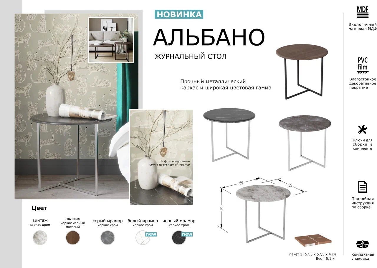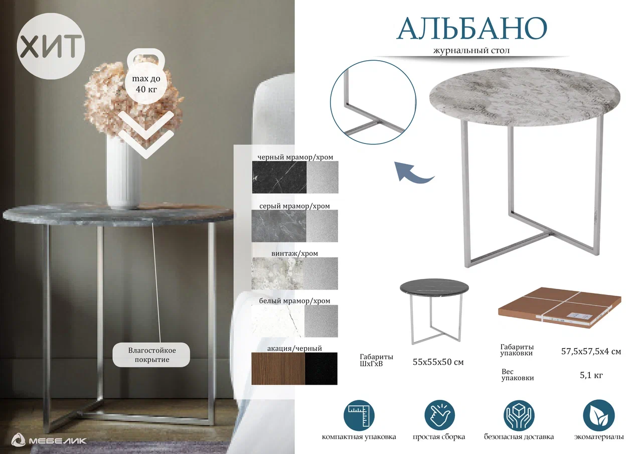 Журнальный столик "Альбано" выполнен в стиле лофт, сочетающем оригинальную текстуру декоративного покрытия столешницы и металлического подстолья.Варианты цветового решения: Акация / Черный, Белый мрамор / Хром, Серый мрамор / Хром, Черный мрамор / Хром