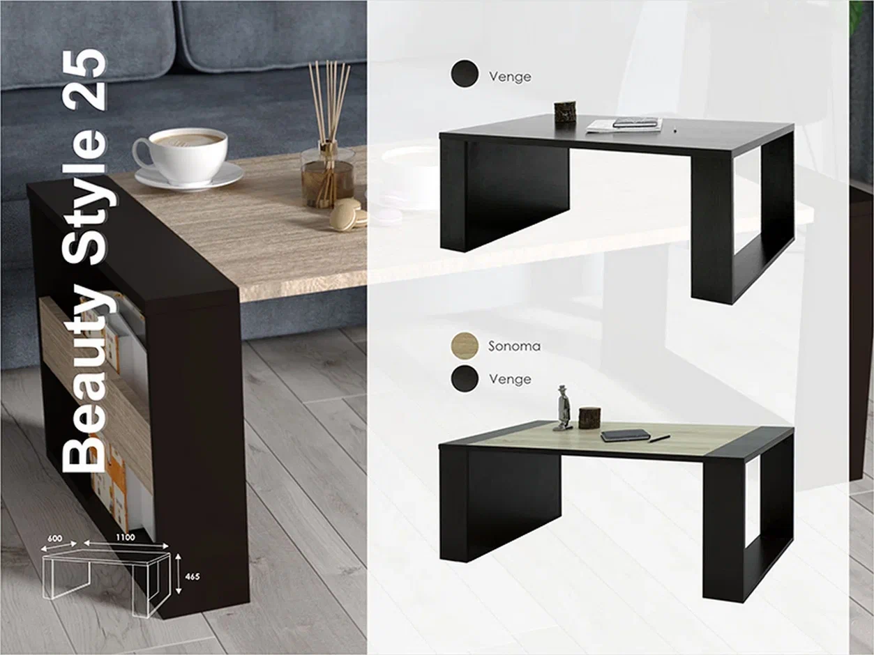 Стол журнальный Beauty Style 25 имеет весьма внушительные размеры 60*110см и только высота 42 см отличает его от полноценного рабочего стола. Тем не менее, в современном интерьере при том, что поработать или поиграть за ноутбуком можно расположившись на низкой мягкой мебели, такой стол вполне может заменить рабочий. Кроме большой рабочей поверхности, у стола есть удобная вместительная полка для книг, журналов, гаджетов, прочих мелочей.