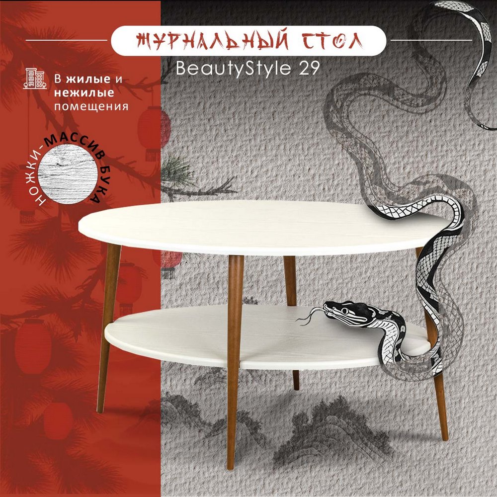 Журнальный стол BeautyStyle 29 будет идеальным дополнением для Вашего дома или квартиры. Его овальная форма и экологичные материалы придают ему неповторимый и элегантный вид, который легко впишется в любой интерьер. Он станет незаменимым помощником в создании атмосферного уголка для чтения или расслабления возле дивана или кресла.Полочка и столешница выполнены из МДФ, обеспечивая долгий срок службы. Устойчивые ножки изготовлены из массива бука, гарантирующего прочность конструкции. Влагостойкое покрытие защитит стол от повреждений и сохранит первозданный вид на протяжении многих лет. Вместительная полка под столешницей предоставляет достаточно места для различных предметов — это отличный вариант для хранения книг или ноутбука.