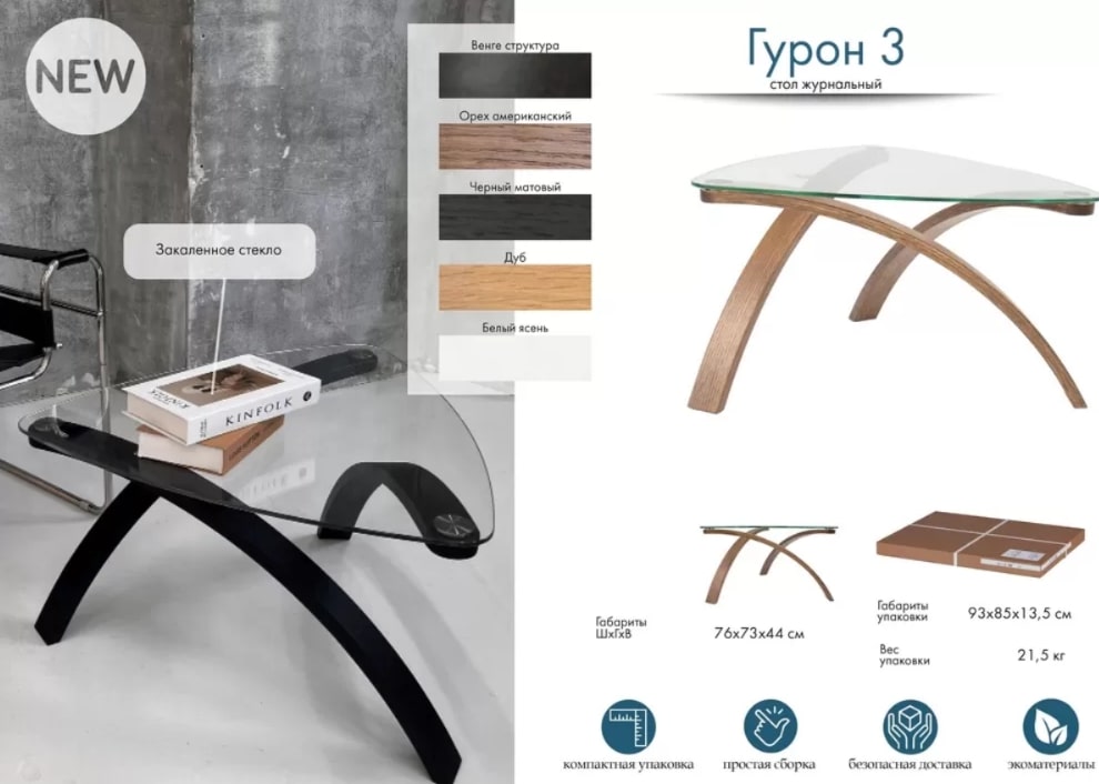 Журнальный стол «Гурон 3» - лаконичность и элегантность. Этот столик - результат размышлений дизайнера о полете. Он настолько легко смотрится в интерьере, что практически не отнимает пространства.За счет стилизованных под перья опор из гнутого дерева и оригинального крепления ножек к поверхности стола, создается ощущение нереальности.