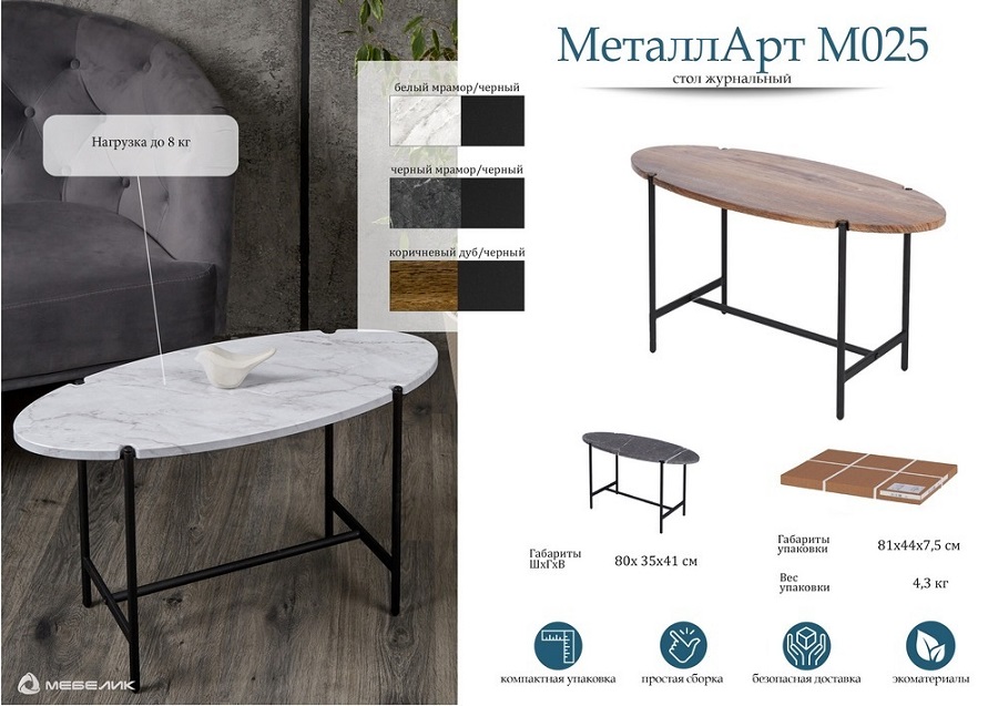 Откройте идеальное сочетание стиля и функциональности с журнальным столом МеталлАрт М025. Столешница из МДФ, покрытая пленкой ПВХ, обеспечивает долговечность и защиту от повреждений, а металлический каркас гарантирует устойчивость и надежность. Выемки на столешнице под ножки придают ему изюминку и подчеркивают изысканный вкус.