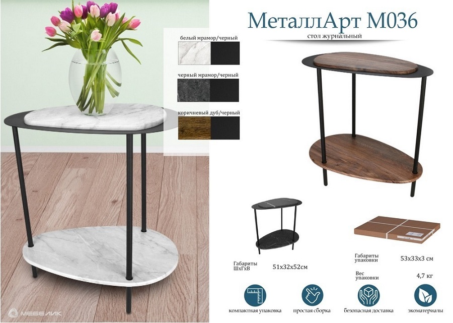 Стол журнальный М036 — станет идеальным выбором для ценителей современного дизайна и функциональности. Его металлический каркас обеспечивает надежность и устойчивость к ударам и царапинам, что делает его долговечным элементом вашего интерьера. Столешница и удобная полочка выполнены из МДФ с покрытием из пленки ПВХ, что гарантирует устойчивость к высоким температурам и придает столу элегантный вид.Столик оснащен накладками для защиты пола, чтобы уберечь покрытие от царапин и повреждений.