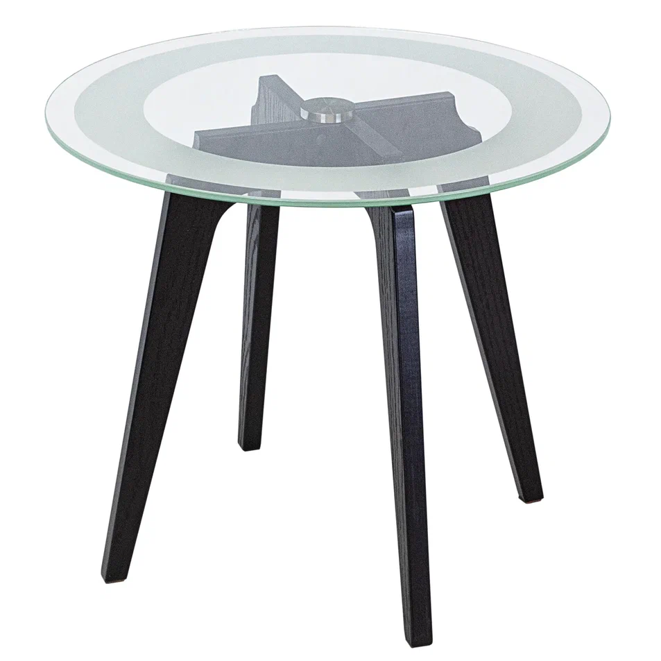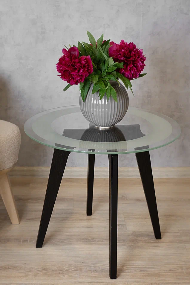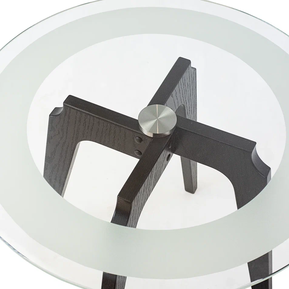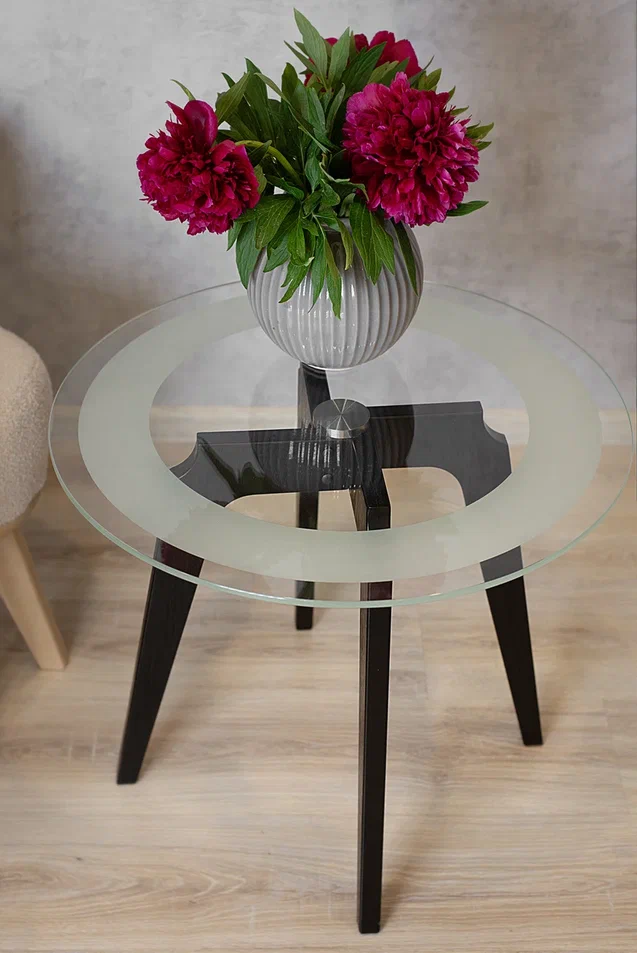 Журнальный столик Рилле 447 – это утончённый и компактный предмет мебели, подходящий для любого интерьера от классики до лофта. Рилле 447 прекрасно справляется с ролью как журнального, так и прикроватного или придиванного столика.Четыре опоры, выполненные из шпона берёзы (толщиной 24 мм), обеспечивают устойчивость, надёжность и долгую службу, а покрытие эмалью и тиснение с имитацией рисунка дерева придают столику естественную красоту. Изящность столешницы диаметром 580мм из стекла толщиной 8мм подчёркивает эстетичный пескоструйный рисунок шириной 70мм, создающий внутреннюю окружность. В сочетании с геометрическим крестообразным узором он добавит уникальности любому интерьеру.