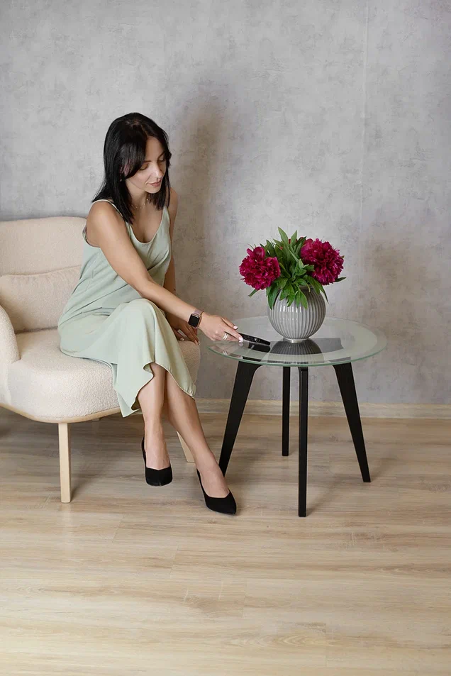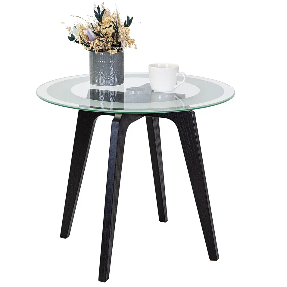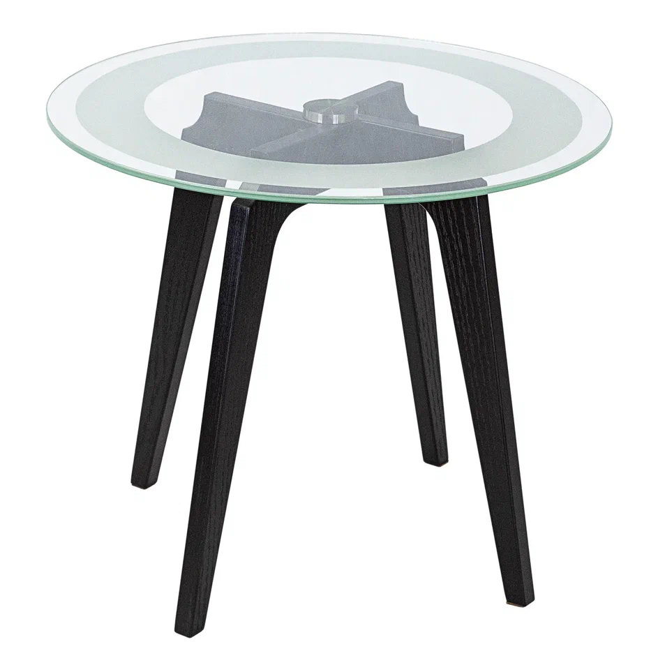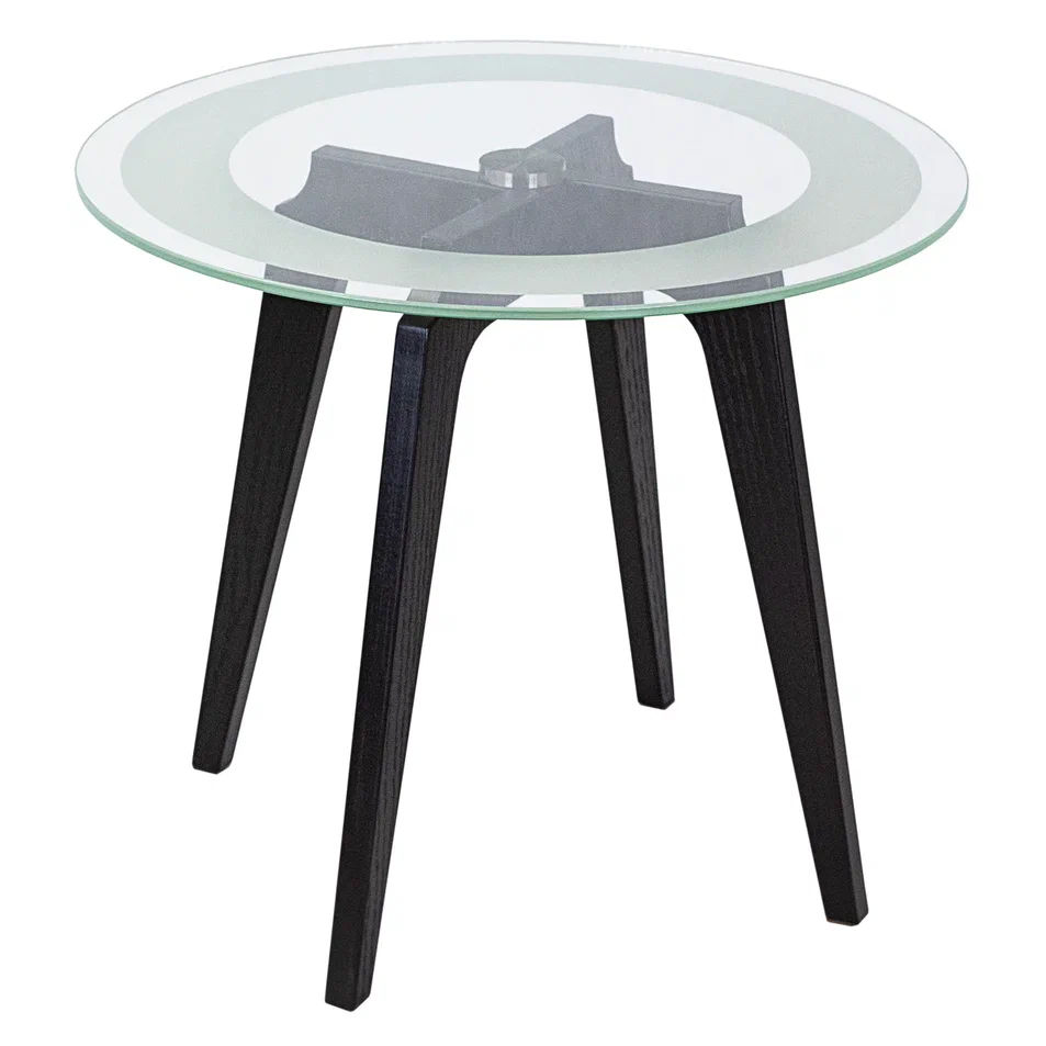 Журнальный столик Рилле 447 – это утончённый и компактный предмет мебели, подходящий для любого интерьера от классики до лофта. Рилле 447 прекрасно справляется с ролью как журнального, так и прикроватного или придиванного столика.Четыре опоры, выполненные из шпона берёзы (толщиной 24 мм), обеспечивают устойчивость, надёжность и долгую службу, а покрытие эмалью и тиснение с имитацией рисунка дерева придают столику естественную красоту. Изящность столешницы диаметром 580мм из стекла толщиной 8мм подчёркивает эстетичный пескоструйный рисунок шириной 70мм, создающий внутреннюю окружность. В сочетании с геометрическим крестообразным узором он добавит уникальности любому интерьеру.