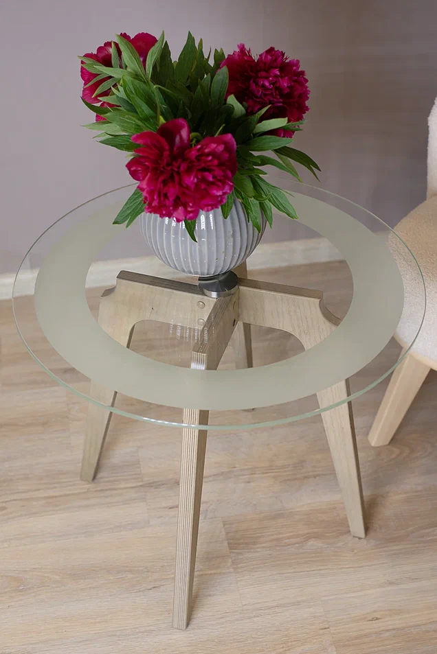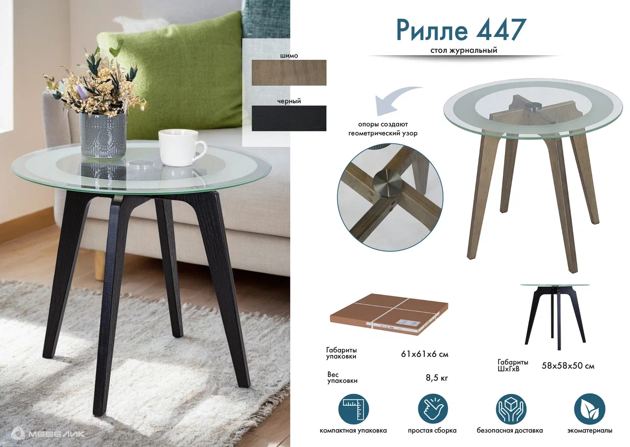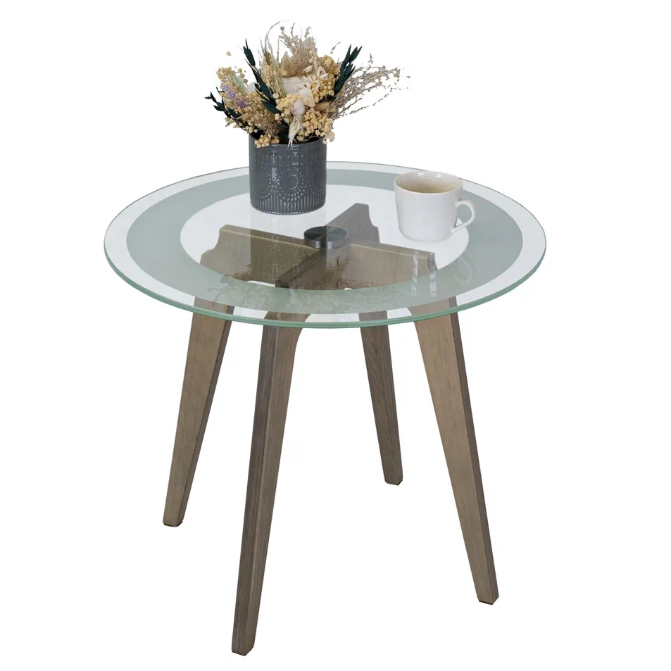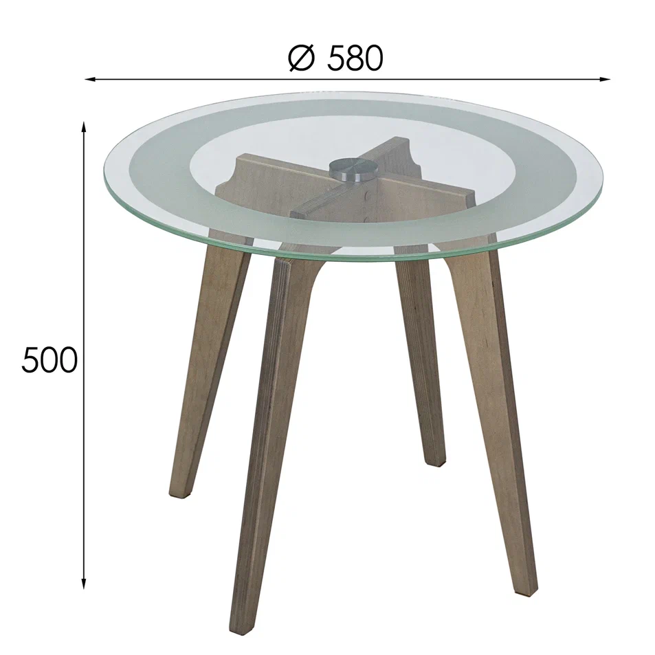 Журнальный столик Рилле 447 – это утончённый и компактный предмет мебели, подходящий для любого интерьера от классики до лофта. Рилле 447 прекрасно справляется с ролью как журнального, так и прикроватного или придиванного столика.Четыре опоры, выполненные из шпона берёзы (толщиной 24 мм), обеспечивают устойчивость, надёжность и долгую службу, а покрытие эмалью и тиснение с имитацией рисунка дерева придают столику естественную красоту. Изящность столешницы диаметром 580мм из стекла толщиной 8мм подчёркивает эстетичный пескоструйный рисунок шириной 70мм, создающий внутреннюю окружность. В сочетании с геометрическим крестообразным узором он добавит уникальности любому интерьеру.