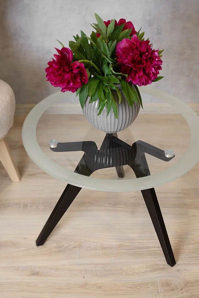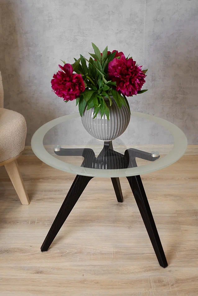 Рилле 449 – журнальный столик, добавляющий эстетичную красоту в любой интерьер, создающий уют и нежное настроение для вас и ваших гостей.Главное украшение Рилле 449 – подстолье из трёх фигурных опор, создающих изящный геометрический узор. Сами опоры выполнены из шпона берёзы (толщиной 24 мм) и покрыты эмалью, что гарантирует и красоту, и надёжность стола, а тиснение с имитацией рисунка дерева придаёт Рилле 449 натуралистичность вида. Завершающим элементом стала круглая столешница диаметром 580мм из стекла толщиной 8мм, которую обрамляет утончённый пескоструйный рисунок шириной 45мм.