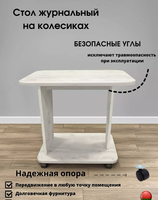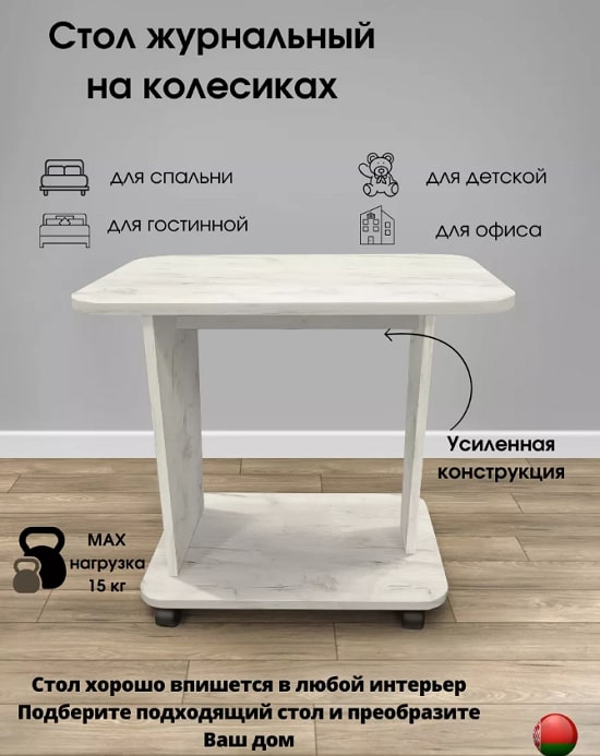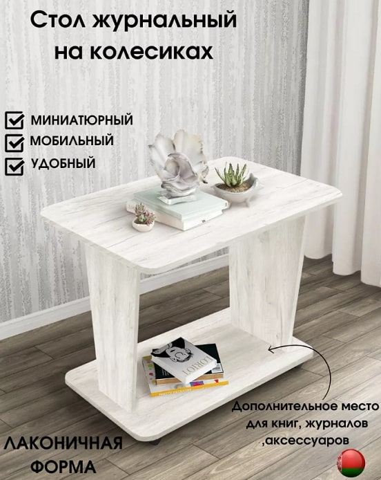 Колесики позволят легко передвигать стол по комнате, а полка подойдет для хранения книг, журналов и мелких, нужных предметов. Кроме размещения газет и журналов, стол журнальный служит и для организации зоны отдыха или детского уголка, местом для комнатных растений и даже прикроватной тумбочкой.