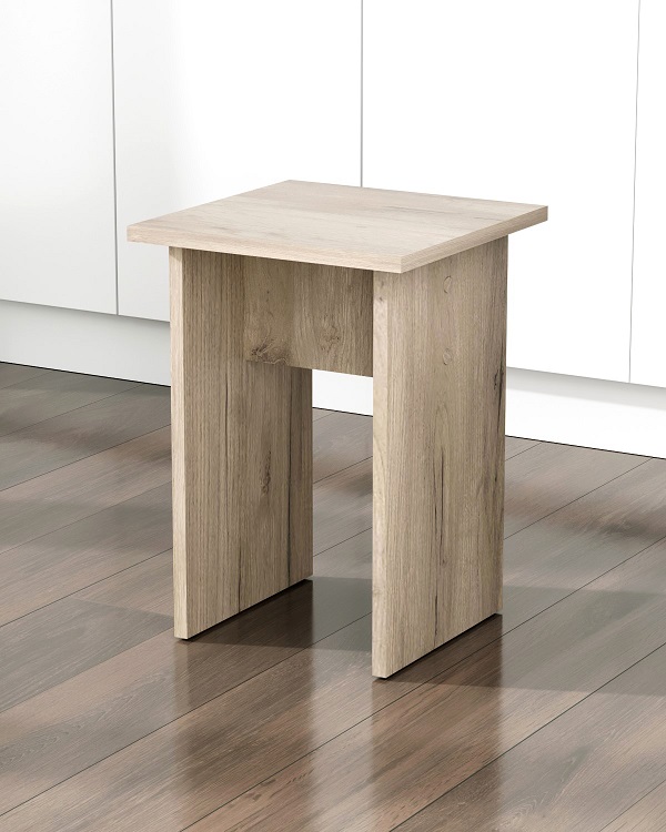 Табурет изготавливаются из распространенного и недорогого материала – ламинированное ДСП 16мм. Материал обладает повышенной устойчивостью к царапинам и повреждения. Края обработаны кромкой.Табурет для кухни – простая, популярная мебель от белорусского производителя, которая есть практически в каждом доме или даче.
