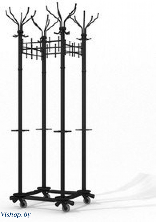 Вешалка гардеробная для одежды Титан Мета Гардикс 4 К на колесах дает возможность компактно разместить большое количество одежды на четырех пятирожковых головах и четырех решетках с вертикальными штырями. Групповая вешалка оборудована четырьмя подставками для зонтов-тростей с чашечками для сбора воды.Характеристики: