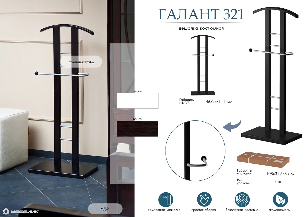 Строгая костюмная вешалка в спальню, прихожую, кабинет. Очень устойчивая конструкция, натуральные материалы, компактная упаковка.Много дополнительных перекладин для галстука, платка, шарфа. Размер плечиков ориентирован на мужской костюм.