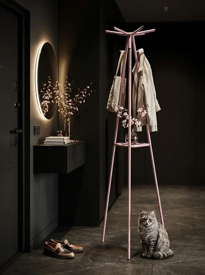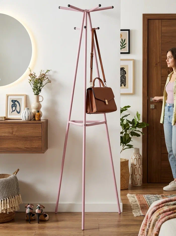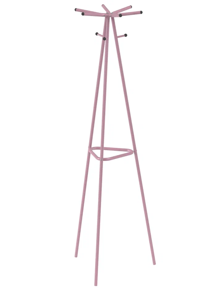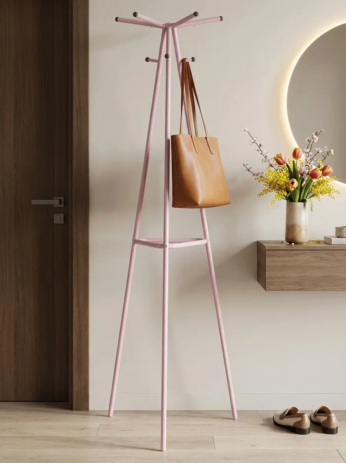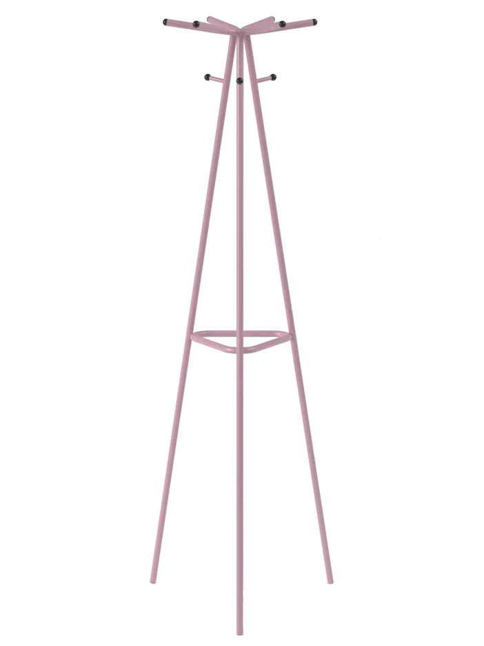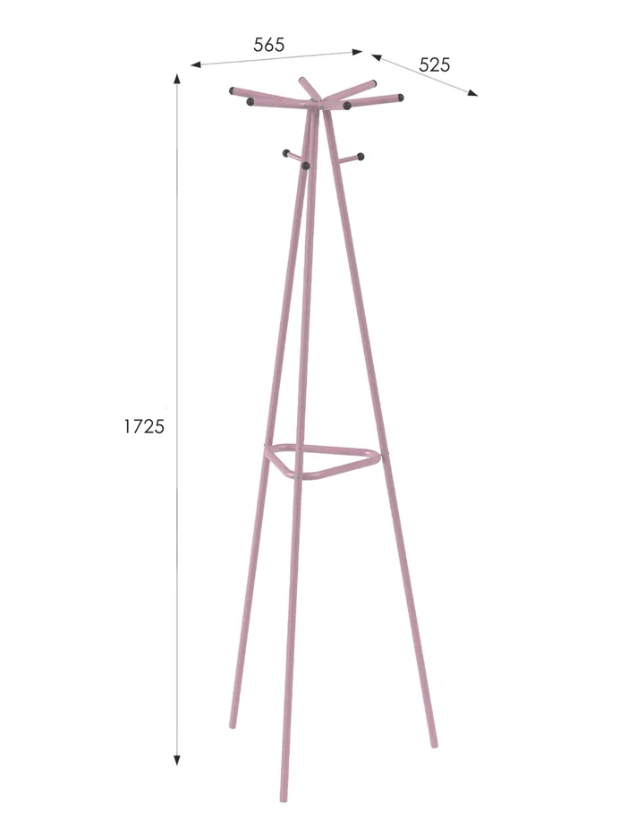 При всей своей простоте и кажущейся легкости эта модель очень устойчива за счет широкого выноса ножек. Любая конструкция на трех точках опоры никогда не будет качаться даже на неровном полу! У этой модели есть особенность – это треугольный элемент в сумочной зоне. На него вы сможете повесить зонты а используя S-образные крючки навесить столько сумок сколько найдете дома от это вешалка станет только устойчивей.