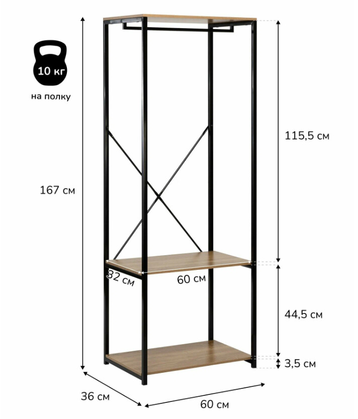 Напольная вешалка Leset Вудми с двумя полками — компактное решение для хранения верхней одежды и аксессуаров. Прочный каркас обеспечивает надежную фиксацию штанги и полок, а современный дизайн в сочетании дерева и металла гармонично впишется в интерьер прихожей или гардеробной.Деревянные полки свободно вместят сумки, головные уборы или корзины, освобождая пространство от хаоса.