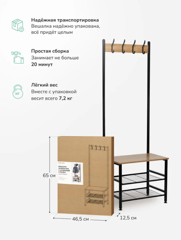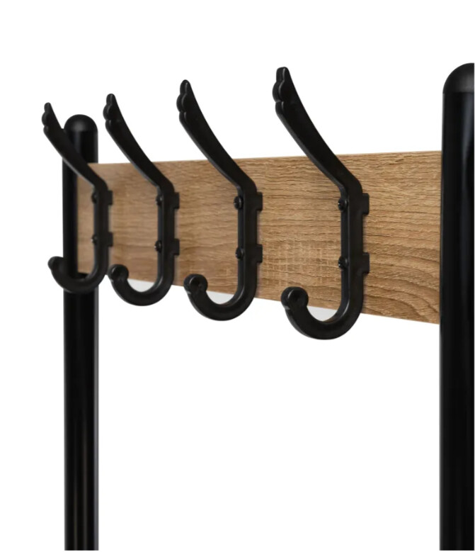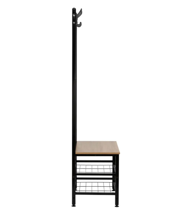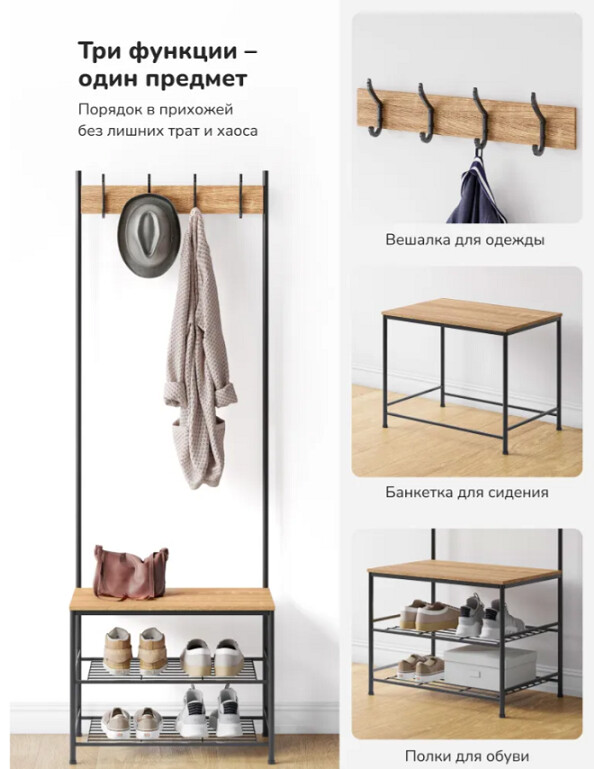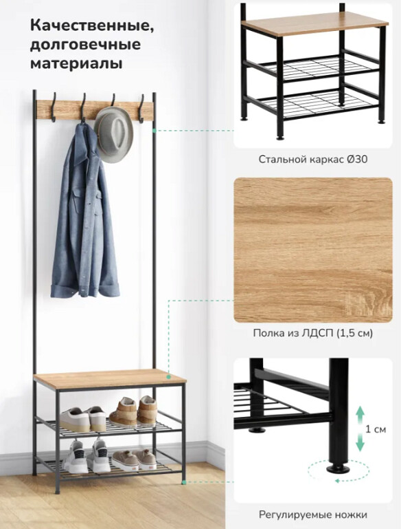 Напольная вешалка Leset Вудми с обувницей и тремя полками — компактное решение для хранения верхней одежды, обуви и аксессуаров. Прочный каркас обеспечивает надежную фиксацию штанги и полок, а современный дизайн в сочетании дерева и металла гармонично впишется в интерьер прихожей или гардеробной.Деревянные полки свободно вместят сумки, головные уборы или корзины, освобождая пространство от хаоса. Вешалка оснащена крючками, что позволяет разместить на них не только одежду, но и сумки или аксессуары. Полка подставка для обуви обеспечивают надежное хранение вашей обуви, а деревянное сиденье выдерживает большую нагрузку, что делает его удобным для использования всей семьей.