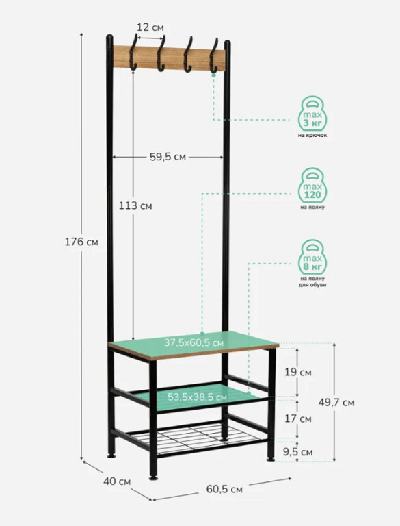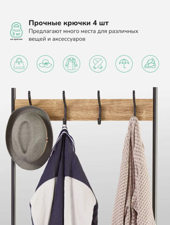 Максимальная нагрузка составляет 30 кг, что позволяет использовать ее как для верхней одежды, так и для одежды и обуви.
