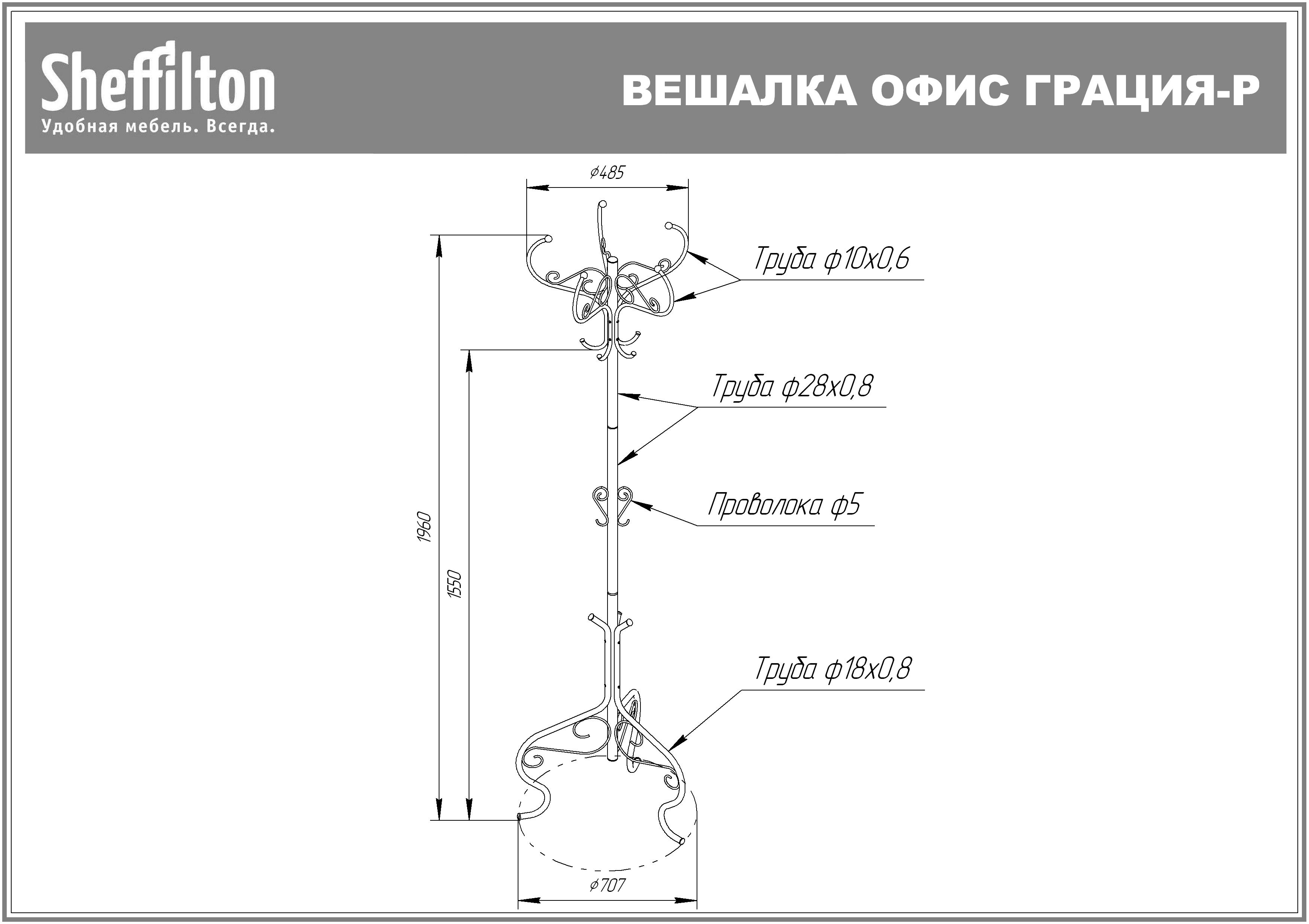 Вешалка напольная Офис создана в винтажном стиле, с оригинальными витыми элементами, похожими на кованные изделия выглядит утончённой и лёгкой! Надежная и устойчивая металлическая вешалка обеспечит не только комфорт, но и стильность вашему помещению. На вешалке вы сможете разместить верхнюю одежду, головные уборы, сумки.Диаметр стойки 28 мм, крючков 10 мм, прутка 5 мм, основания 707 мм, короны 485 мм. Порошковая окраска обеспечивает стойкость к механическим воздействиям.