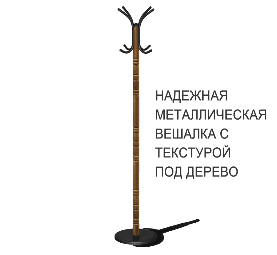Оригинальный декор стойки вешалки SHT-CR14 стилизован под дизайн изделий из дерева, эта особенность придаст элегантность любому помещению. Устойчивое металлическое основание диаметром 35 см, позволяет "не заваливаться" под весом одежды. Вешалка с металлическим основанием самый простой и удобный способ принять большой поток гостей в кафе, ресторане, отеле или в вашем доме.Вешалка выполнена из металлической трубы (диаметр 5,1 см) и пластиковой фурнитуры 1,8 см. Вешалка имеет 4 металлических крючка (диаметр/толщина - 16х0,6мм). Металлические детали окрашены порошковой краской, устойчивой к механическому воздействию. Расстояние от пола до крючков 158 см