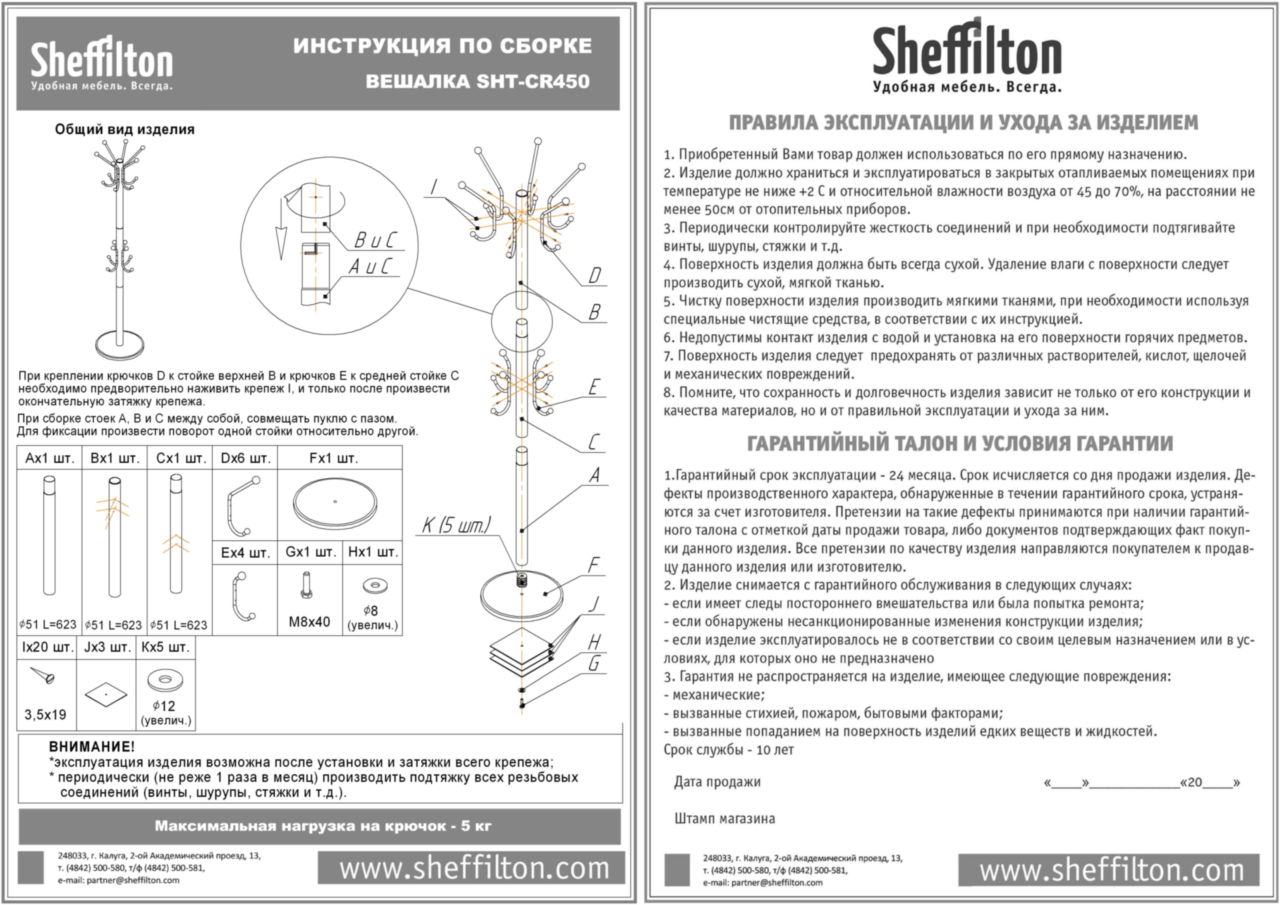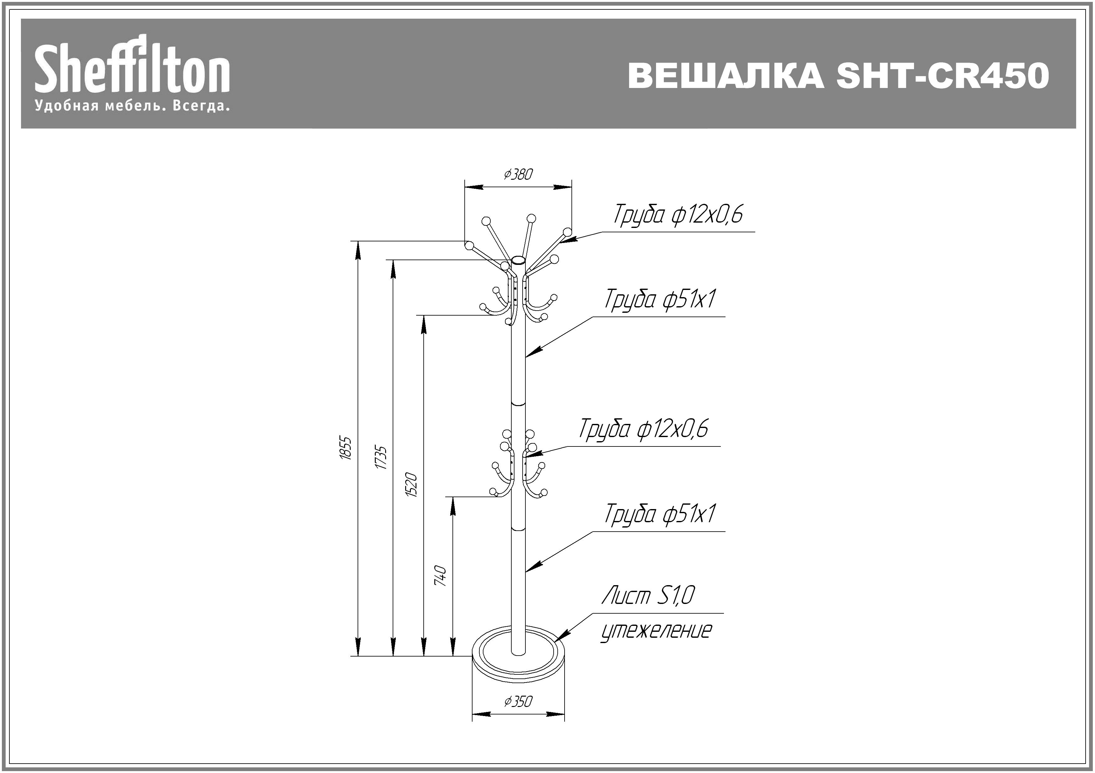 Вешалка напольная Sheffilton SHT-CR450 в сдержанном классическом стиле, очень устойчивая и вместительная. Вешалка с усиленным основанием самый простой и удобный способ принять большой поток гостей в кафе, ресторане, отеле или в вашем доме. В качестве усиления в основании вешалки используется тройной слой груза. Устойчивое металлическое основание (350х350х25 мм.) позволяет вешалке "не заваливаться" под весом одеждыМаксимально практичная и функциональная конструкция. Стойка вешалки выполнена из металлической трубы, диаметром 51 мм, крючки - 12 мм. Порошковое покрытие стойки обеспечивает стойкость к механическим воздействиям. Предусмотрено 6 крючков на короне для верхней одежды и 4 крючка на стойке для сумок и зонтов. Размеры короны: 395х395х340 мм. Расстояние от основания до средних крючков: 745 мм.