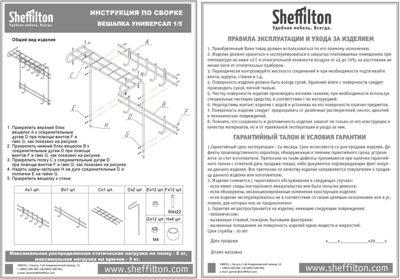 Максимальная распределенная статическая нагрузка на крючок - 5 кг, на полку - 8 кг.