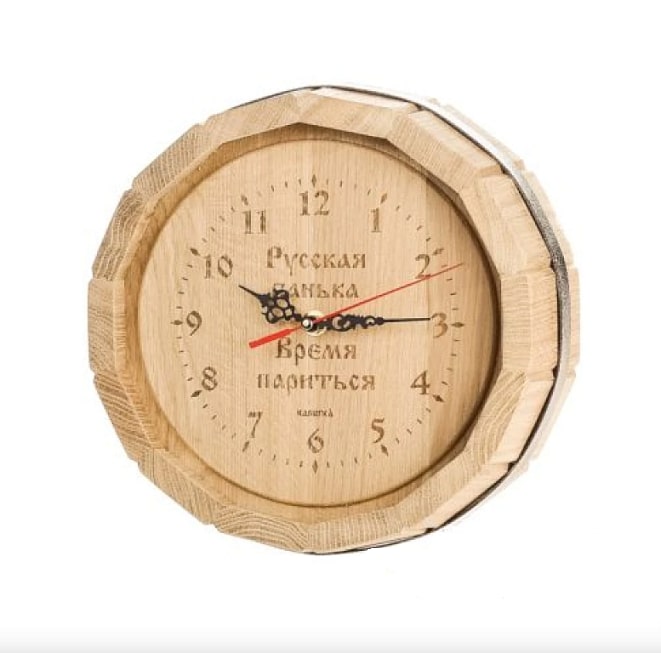 Часы настенные бондарные выполнены из дуба с пословицей "Русская банька время париться"Часы изготовлены из дерева дуба, которое отлично справляется с перепадами температур и повышенной влажностью, свойственным для бани. Часовой механизм также надежно защищен от повреждений деревянным корпусом. Вы можете не сомневаться, что такие часы прослужат вам долгое время.