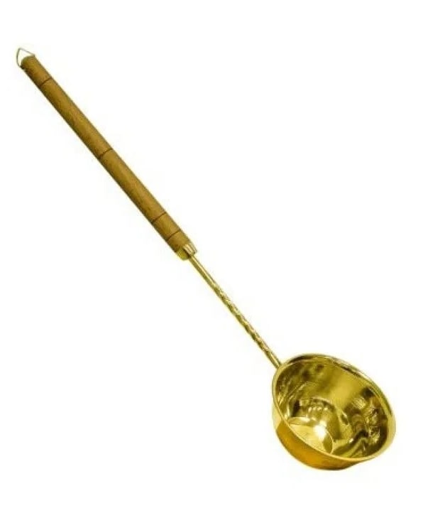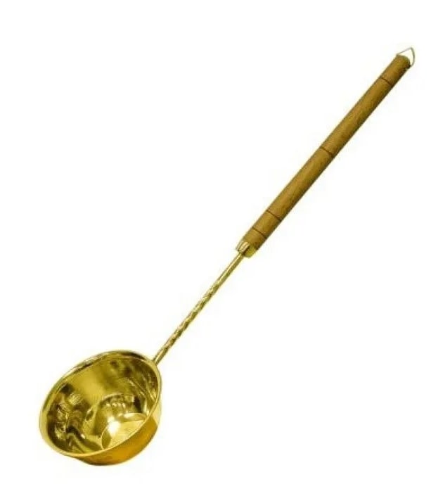Большой универсальный черпак из латуни подойдет для забора воды из различных ёмкостей, им удобно подливать кипяток в шайку или купель, в нем можно развести настой или отвар для ароматерапии, а также использовать для поддачи пара — длинная ручка поможет в этом случае избежать ожога горячим паром. Помимо удобства, латунь благотворно влияет на качество воды, обогащая её полезными для здоровья микроэлементами.-Устойчив практически по всем внешним воздействиям