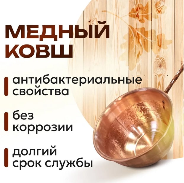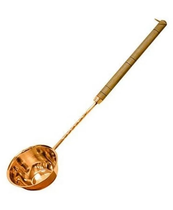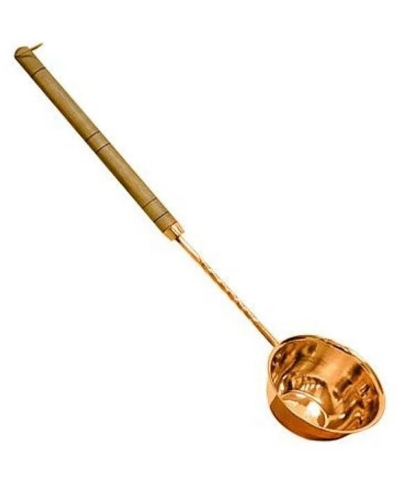 Большой универсальный черпак из меди подойдет для забора воды из различных ёмкостей, им удобно подливать кипяток в шайку или купель, в нем можно развести настой или отвар для ароматерапии, а также использовать для поддачи пара — длинная ручка поможет в этом случае избежать ожога горячим паром. Помимо удобства, латунь благотворно влияет на качество воды, обогащая её полезными для здоровья микроэлементами.-Устойчив практически по всем внешним воздействиям