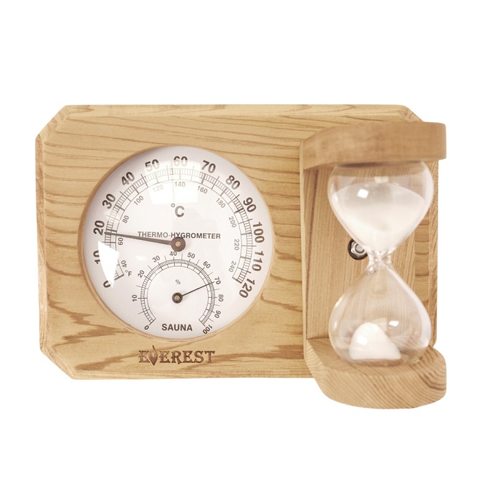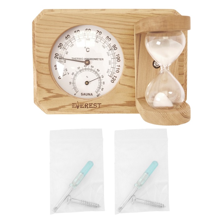 Термогигрометр создан для измерения влажности и температуры воздуха внутри помещения сауны или бани и представляет из себя деревянный корпус с окошком посредине, содержащим полукруглый графичный циферблат и песочные часы.Все материалы экологически чистые, не выделяют вредных веществ и запахов и имеют долгий срок эксплуатации.