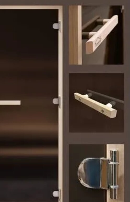 Комплектация стеклянных дверей серии "LITE" для бани включает основные элементы:1. Дверная коробка (40×75 мм) — изготовлена из осины, что обеспечивает прочность и долговечность конструкции, а также эстетичный внешний вид. Размеры коробки позволяют легко установить дверь в стандартные проемы, обеспечивая надежную фиксацию и герметичность.