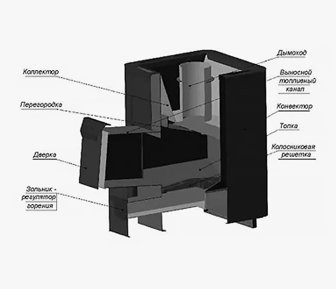 Глубокая ёмкая каменка является мощным парогенератором. Большое количество нагретых камней обеспечивает стабильность температуры в помещении. Печь оснащена выносным топливным каналом, что позволяет топить печь из смежного помещения. Длинная колосниковая решетка из массивного литейного чугуна, обеспечивает равномерное и мощное горение дров. Печь снабжена удобным выдвижным зольником, являющимся также регулятором интенсивности горения. Все наружные поверхности печи окрашены двумя слоями жаростойкой кремнийорганической эмалью. Большая каменка при небольших габаритах печи, современный внешний вид, высокая динамика нагрева, простота эксплуатации печи в совокупности с доступной ценой, бесспорно делают данную модель лидером в сегменте «эконом» класса.