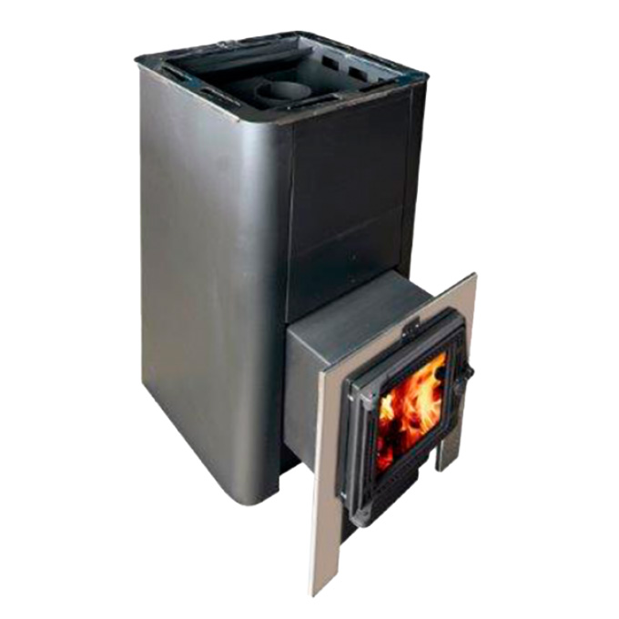 Глубокая емкая каменка печи является мощным парогенератором. Большое количество качественно нагретых камней, обеспечивает стабильность температуры в парилке. Печь оснащена выносным топливным каналом, что позволяет топить печь из смежного помещения. Длинная колосниковая решетка из массивного литейного чугуна, обеспечивает равномерное и мощное горение дров, столь необходимое для банной печи.