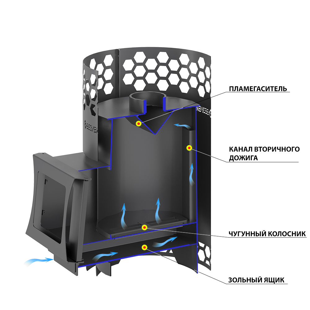 Печь сделана из особо прочной котловой стали марки 09Г2С с толщиной стенок от 3 до 4 мм. Дизайн корпуса печи выполнен в виде сот. Диаметр дымохода 115 мм. Дверка имеет правое и левое открытие. Улучшенная загрузка дров благодаря расположению двери под углом.Печи представлены как со стеклом, так и без него. Так же есть возможность дополнить печь баком на 50 литров, подиумом высотой в 70 мм и фронтальным экраном.