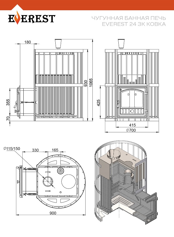 Чугунная банная печь Эверест 24 в кованной сетке с закрытой каменкой.Большая мощность, эстетичный внешний вид, высокая теплоёмкость, вместительная каменка – вот ключевые отличия сборной чугунной печи Эверест 24. Печь рассчитана на объём парного отделения от 14 до 26 кубических метров.