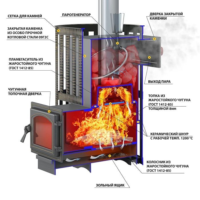 - Материал закрытой каменки: Особо прочная котловая сталь (09Г2С)