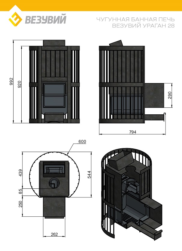Печь ВЕЗУВИЙ Ураган Стандарт 28 (ДТ-4) диаметр дымохода: 115 мм