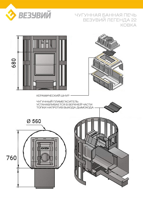 Преимущество печи «Легенда» в том, что топка состоит из двух элементов, толщиной не менее 12 мм. На стыке между ними используется керамический шнур с рабочей температурой 1200 градусов. То есть топка печи абсолютно герметична! Для фиксации деталей между собой применяется болтовое соединение, что даёт 100% гарантию безопасности при эксплуатации.Банная чугунная печь Легенда ковка 22 (270) укомплектована чугунной герметичной дверцей Везувий 270 с жаропрочным стеклом «SHOT ROBAX», и кованным конвекционно-вентилируемый кожухом. В конструкции данной печи предусмотрен топочный тоннель длиной 250 мм, при помощи которого печь топится из соседнего помещения, смежного с парильным.