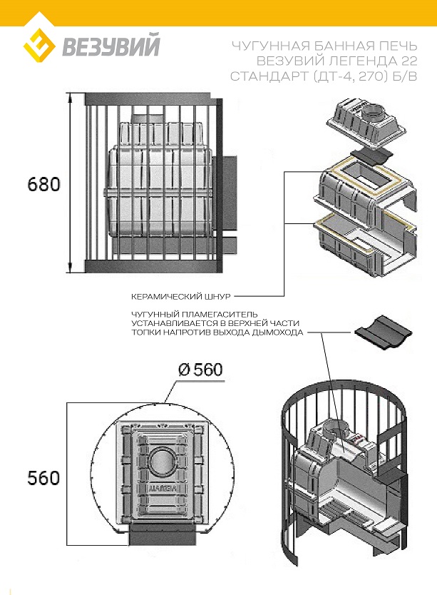 Преимущество печи в том, что топка печи состоит из 3-х элементов. На стыке между ними используется керамический шнур с рабочей температурой 1200 градусов. То есть топка печи абсолютно герметична! Для фиксации деталей между собой применяется болтовое соединение, что даёт 100% гарантию безопасности при эксплуатации.Банная чугунная печь Легенда Стандарт 22 (ДТ-4) укомплектована чугунной не герметичной дверцей Везувий ДТ-4. Конвекционно-вентилируемый кожух "Стандарт" изготовлен из металлического прутка диаметром 6мм покрашенной черной термостойкой краской.