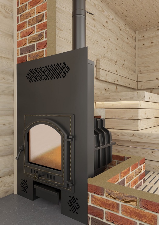 Фронтальный экран устанавливается на топочный тоннель сверху, позволяет на своей основе собрать стену между парной и предбанником из кирпича (толщина портала равна 121 миллиметру) или дерева.