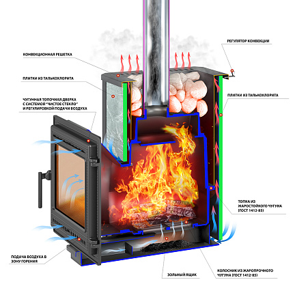 Преимущество печи в том, что топка печи состоит из 3-х ЧУГУННЫХ элементов. На стыке между ними используется керамический шнур с рабочей температурой 1200 градусов. То есть топка печи абсолютно герметична! Для фиксации деталей между собой применяется болтовое соединение, что даёт 100% гарантию безопасности при эксплуатации.Конвекционно–вентилируемая облицовка, изготовленная из экологически чистой горной породы , который обладает большой теплоёмкостью, что позволяет камню в короткие сроки нагреваться и максимально долго удерживать стабильную температуру в парильном помещении, а также гасить жёсткое инфракрасное излучение Камень обладает исключительными лечебными свойствами: помогает при головных болях, при нестабильном артериальном давлении, при простудных заболеваниях, воспалительных процессах в почках и пищеварительной системе, снимает повышенную возбудимость и нервозность, сглаживает эмоциональные всплески. Облицовка из натурального камня при нагреве способна аккумулировать тепло, что гарантирует максимально равномерный прогрев и сохранение тепла
